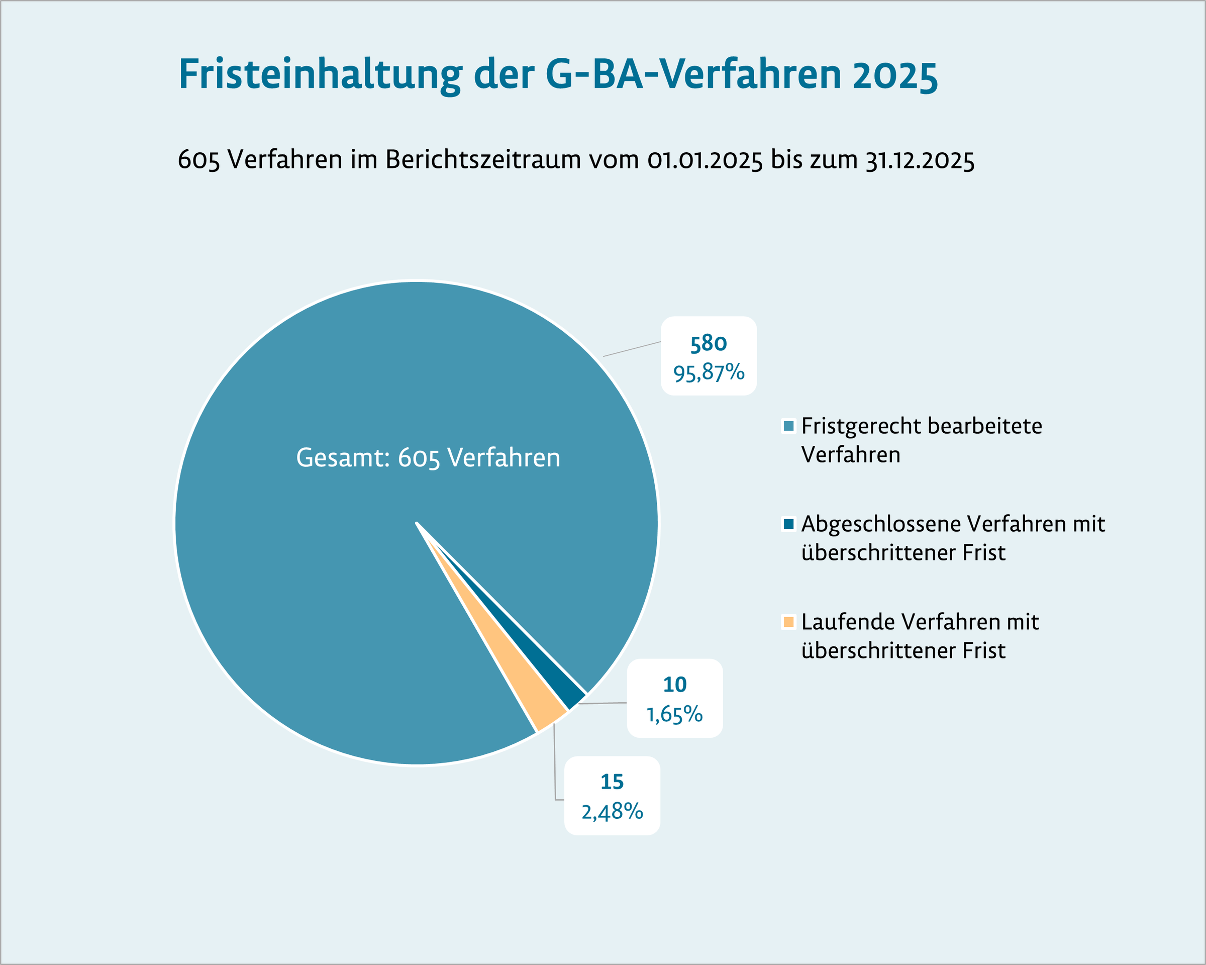 Berlin, 22. April 2026 – Rund 96 Prozent seiner Beratungsverfahren hat der Gemeinsame Bundesausschuss (G-BA) im aktuellen Berichtsjahr, dem Kalenderjahr 2025, fristgerecht bearbeitet. Lediglich bei 25 der insgesamt 605 Verfahren kam es im aktuellen Berichtsjahr zu Verzögerungen. Von diesen verfristeten Verfahren konnten 10 im aktuellen Berichtsjahr beendet werden; 15 der verfristeten Verfahren laufen noch weiter. Damit zeigt sich erneut, dass die Entscheidungsprozesse im G-BA verlässlich funktionieren. Seit zehn Jahren legt der G-BA dem Gesundheitsausschuss des Deutschen Bundestages jährlich im sogenannten Fristenbericht dar, ob und aus welchen Gründen er die gesetzlich vorgesehene Dauer eines Beratungsverfahrens überschreiten musste oder ein Verfahren nicht nach drei Jahren abgeschlossen werden konnte.