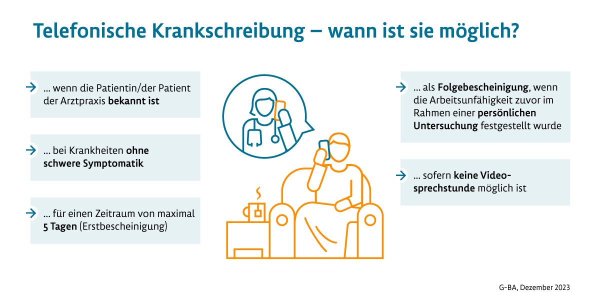 Eine Arbeitsunfähigkeit kann von Arztpraxen – sofern eine Videosprechstunde nicht möglich ist – seit 7. Dezember 2023 auch auf telefonischem Weg festgestellt und bescheinigt werden.